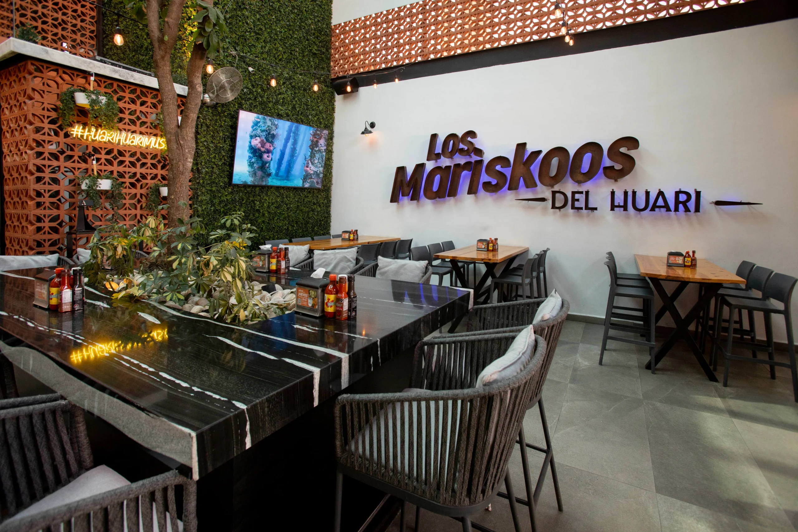 En Mariskoos del Huari, en Torreón, instalamos un sistema integral de audio, video y red WiFi, diseñado para crear una experiencia sensorial envolvente. Cada detalle fue pensado para acompañar la atmósfera del restaurante, brindando un ambiente moderno, conectado y lleno de energía que realza el concepto gastronómico del lugar.